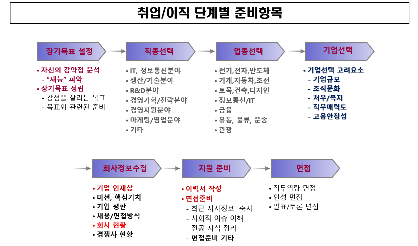 ☞ 취업/이직 단계별 세부 준비항목은 아래 표를 참고하세요.