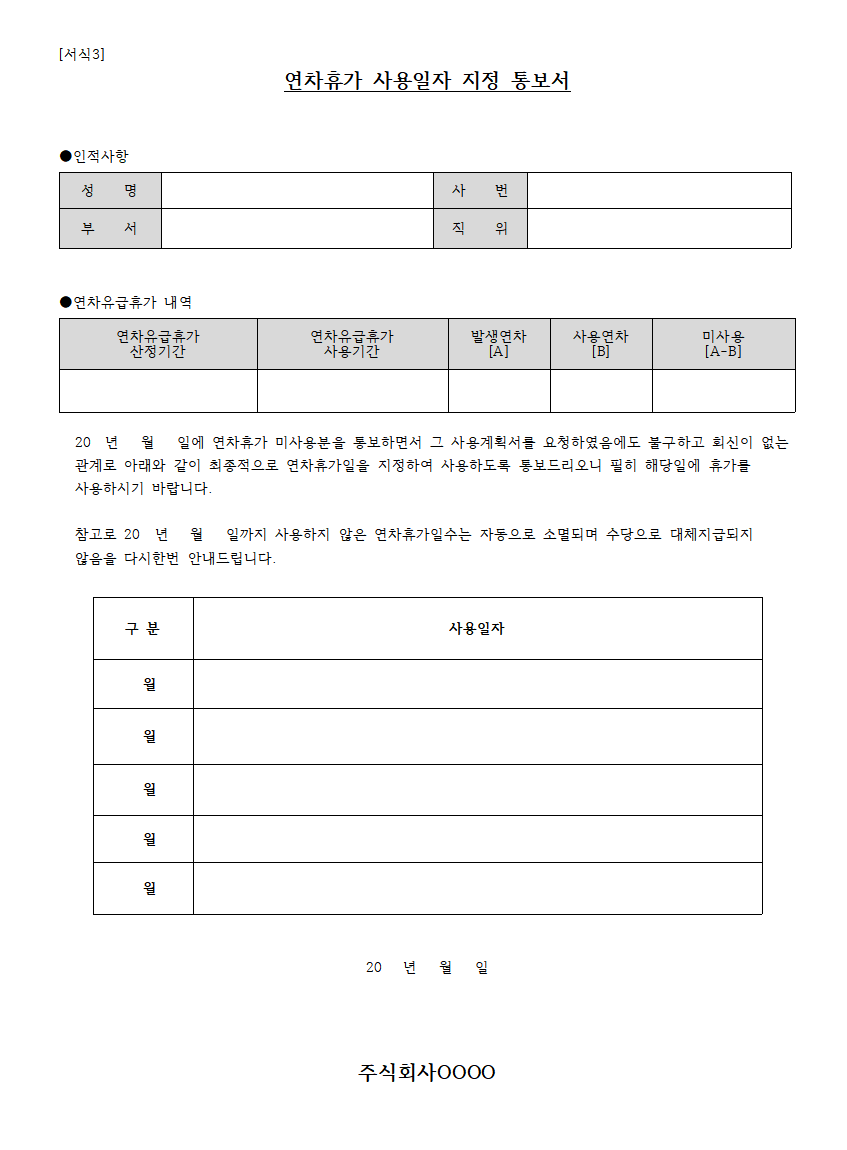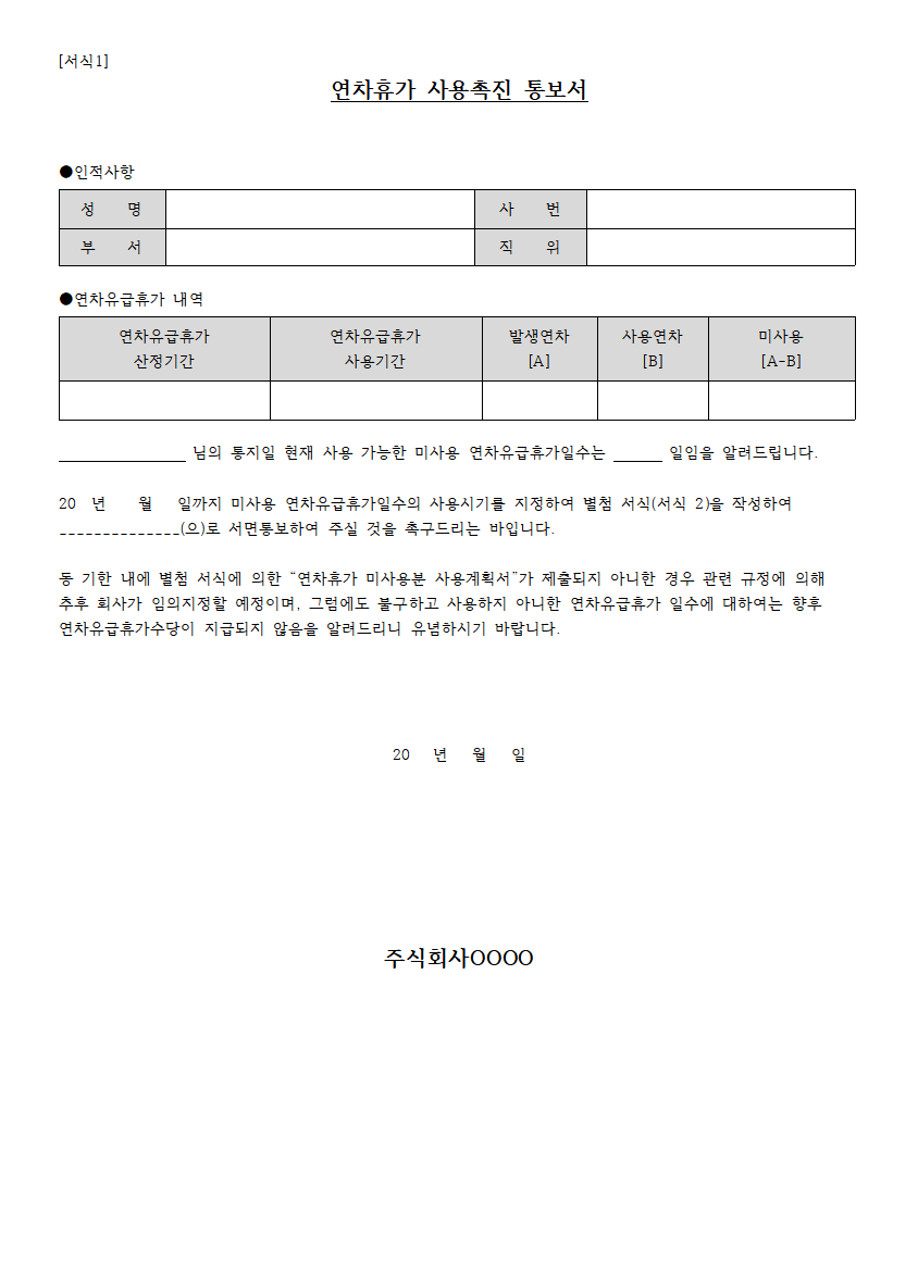 1. 입사이후 11개월이 지난 시점(근속 1년시점의 1개월 전)에 1차 촉진이후 발생한 입사 1년차 연차휴가(최대 2개)에 대하여 5일이내에 직원들에게 사용하지 아니한 휴가 일수를 알려주고 그 사용시기를 정하여 회사에 통보하도록 연차휴가사용촉진통보서(서식1)를 발송한다.