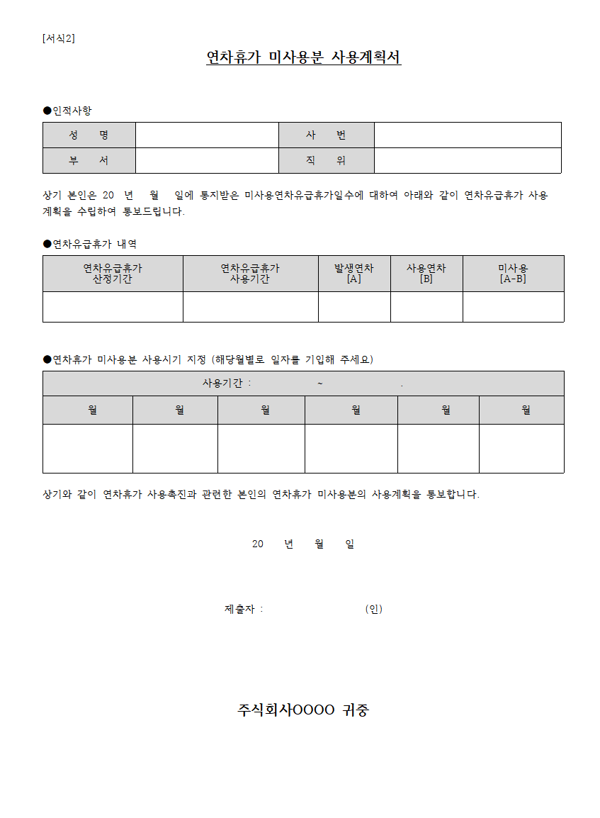 2. 직원은 제1항의 촉구를 받은 때로부터 10일이내에 미사용 휴가의 전부 또는 일부의 사용 시기를 정하여 회사에 연차휴가미사용분사용계획서(서식2)를 통보하여야 한다. 만약 이를 통보하지 아니하면 회사는 근속 1년시점의 1개월전까지 미사용 휴가의 사용시기를 정하여 직원에게 연차휴가사용일자지정통보서(서식3)를 발송하며 이 촉진에도 불구하고 휴가를 사용하지 않는 경우에는 미사용분에 대한 수당을 지급하지 아니한다.